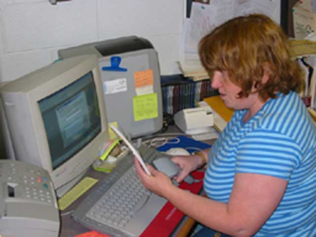 Volunteer Vicki Fankhauser checks in a returned resource. Vicki keeps track of web statistics and a host of other resource tasks.