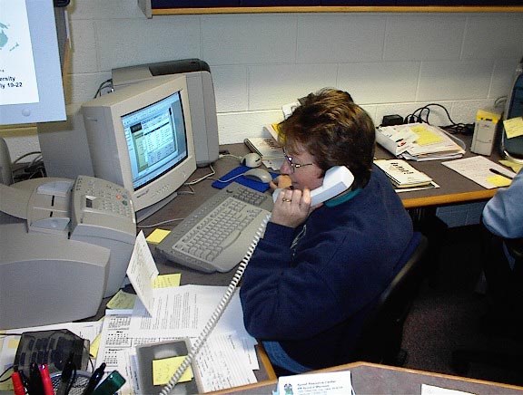Diane Kaufmann's shown demonstrating her cross platform skills while multi-tasking on the phone. Our HP PC is used for checkout and cataloging using RequestManager.