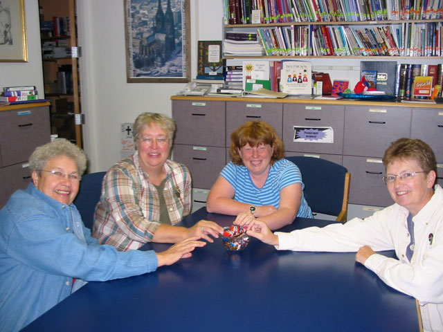 Delores Harrison, Bonnie Weber, Vicki Fankhauser, and Diane Kaufmann reach for the chocolate!